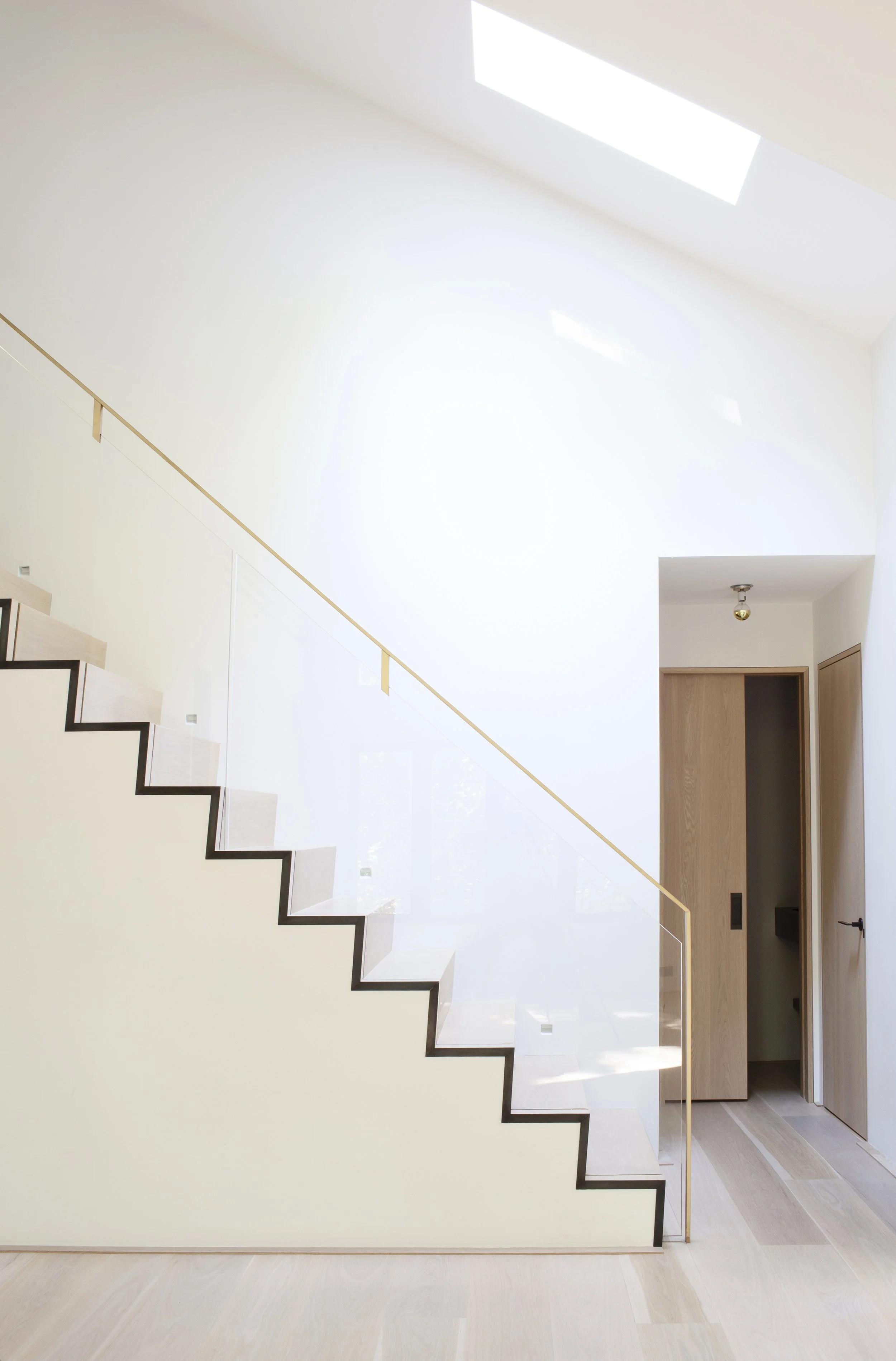 The palette was envisioned with six simple ingredients: black, two variations of bleached white oak, fumed character oak for the kitchen, white and brass accents - so finishes were key in how they interacted with one another. Our millworker, Peter Galicki of Inwood Interiors, was as much a perfectionist as we all pretty much are; and it did almost feel like we made a million samples to get those finishes just right. But of course it was worth it in the end.