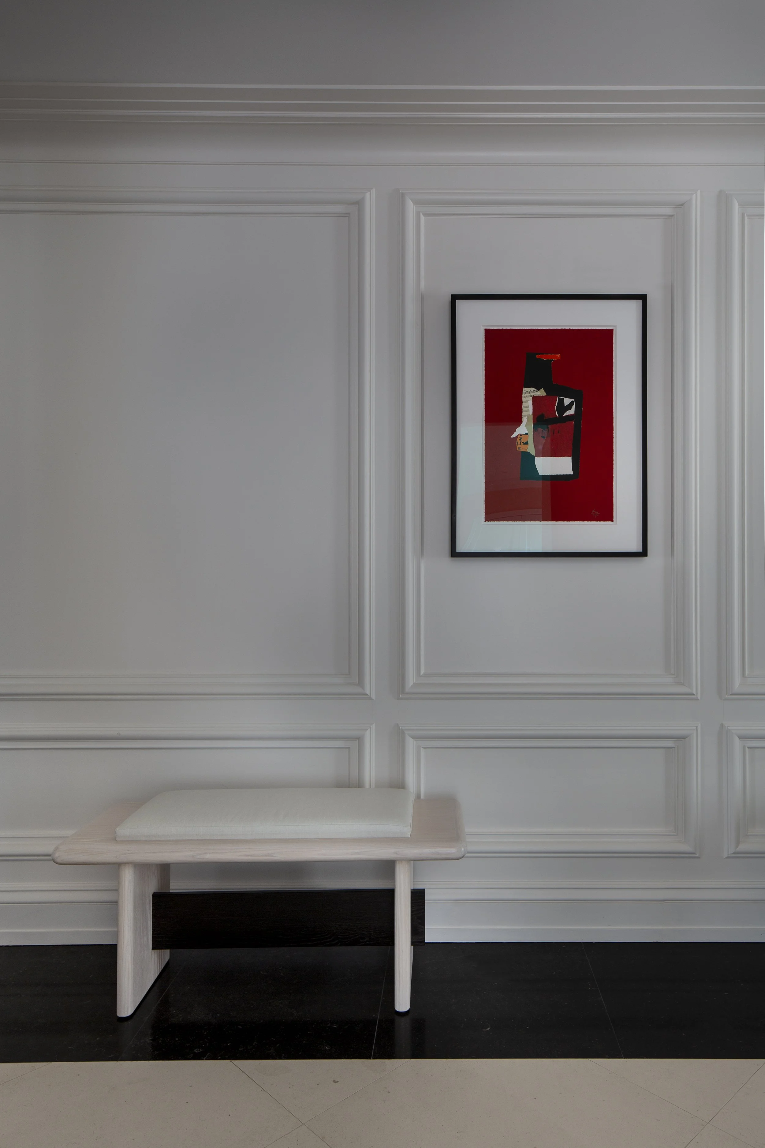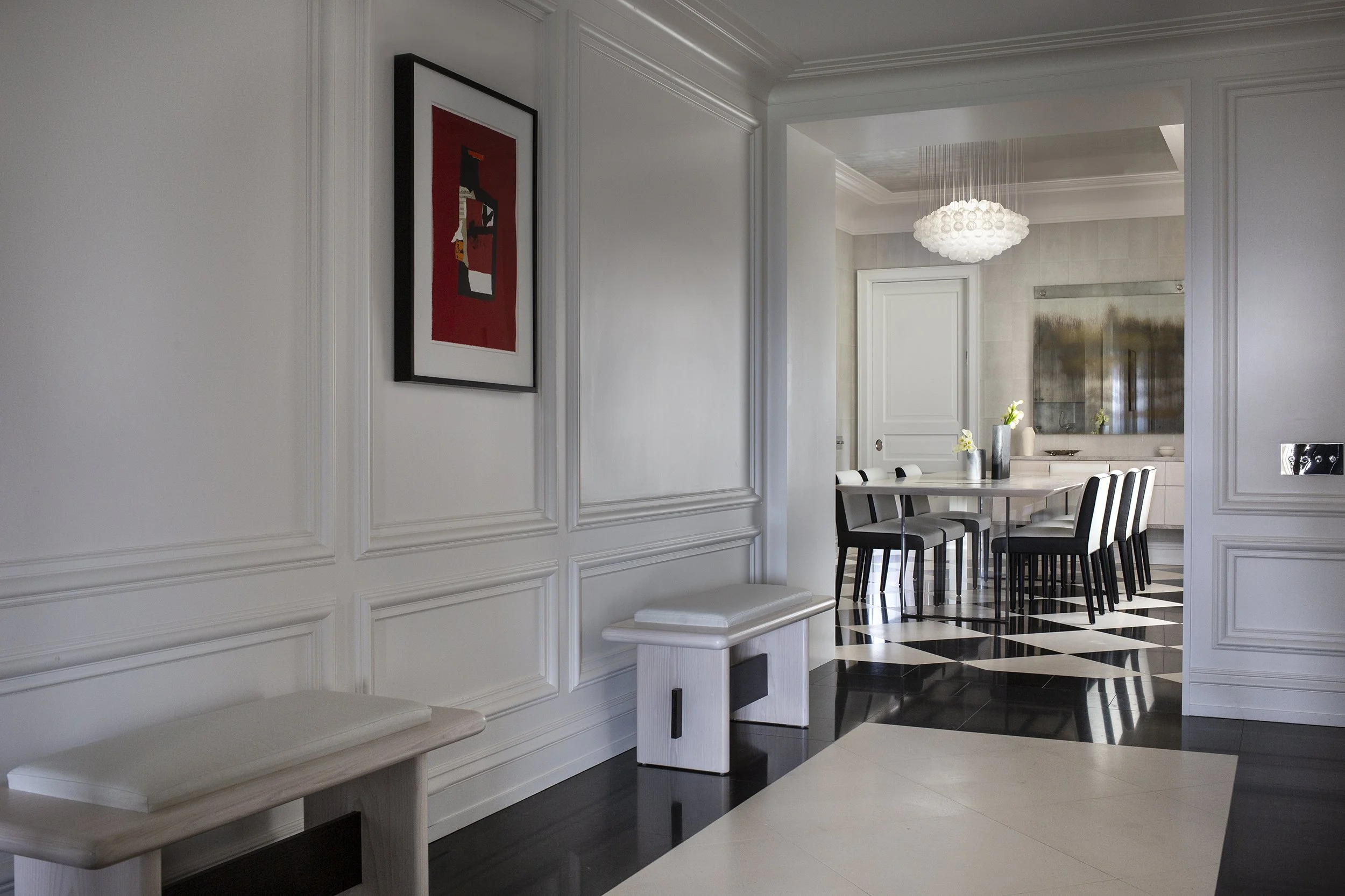The dance here was about how to make it all feel very modern, whilst also employing elements that convey a classical notion of elegance - neo-baroque style moldings, coffered ceilings, the black & white diamond-patterned floor in the dining room, etc. We went with furniture choices that were primarily clean-lined, but with colors that added warmth to each room - and in most cases conversed handsomely with the textural treatments on the walls.